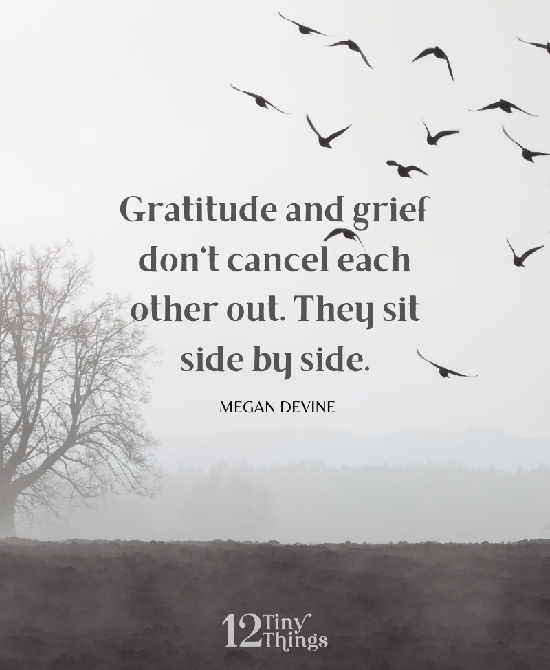 It can be tempting, in the face of loss, to look for silver linings or to say, “just focus on what you still have.” But as Megan Devine says, “Gratitude is not the tylenol of life.” Practicing gratitude doesn’t change what’s wrong. Gratitude doesn’t mean burying unwanted feelings or looking for the silver lining in the midst of a bad situation—gratitude means acknowledging what is still good even alongside the mess. You can experience grief, or anger, or overwhelm even while you are grateful for the good things that remain.